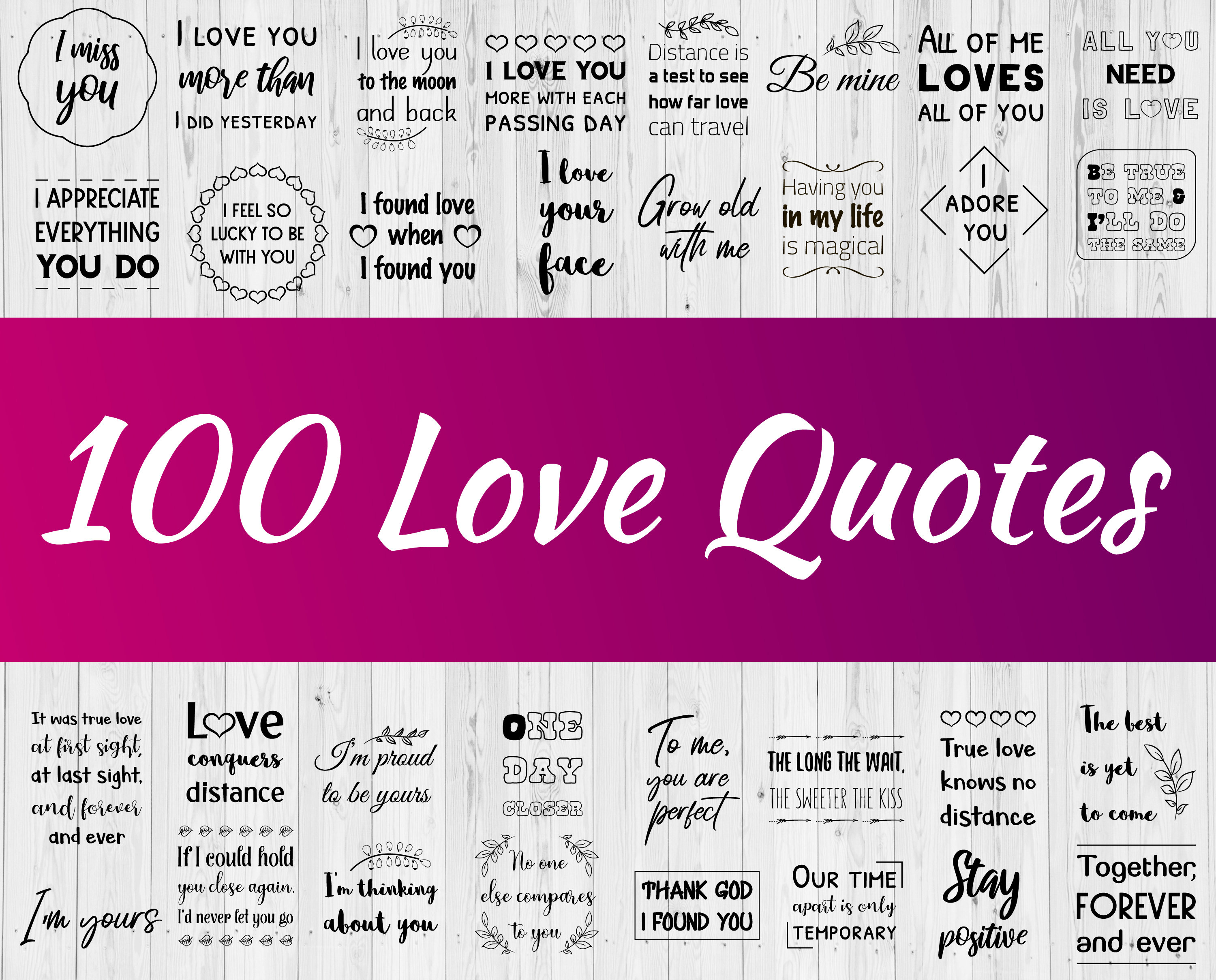 100 Love Quotes Sayings, Valentine's Day, Romantic Feeling, Heart. Set