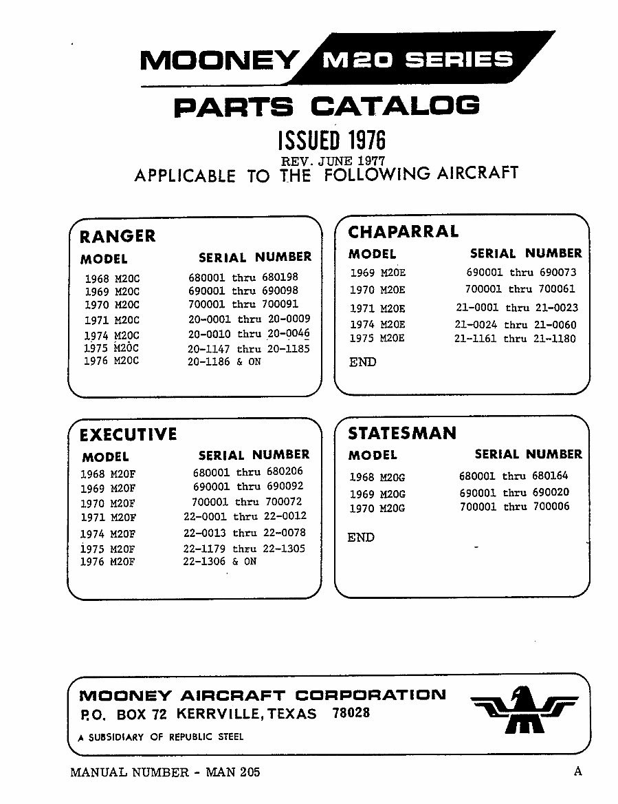 Mooney M20 Series M20C M20E M20F M20G Illustrated Parts Catalog Manual