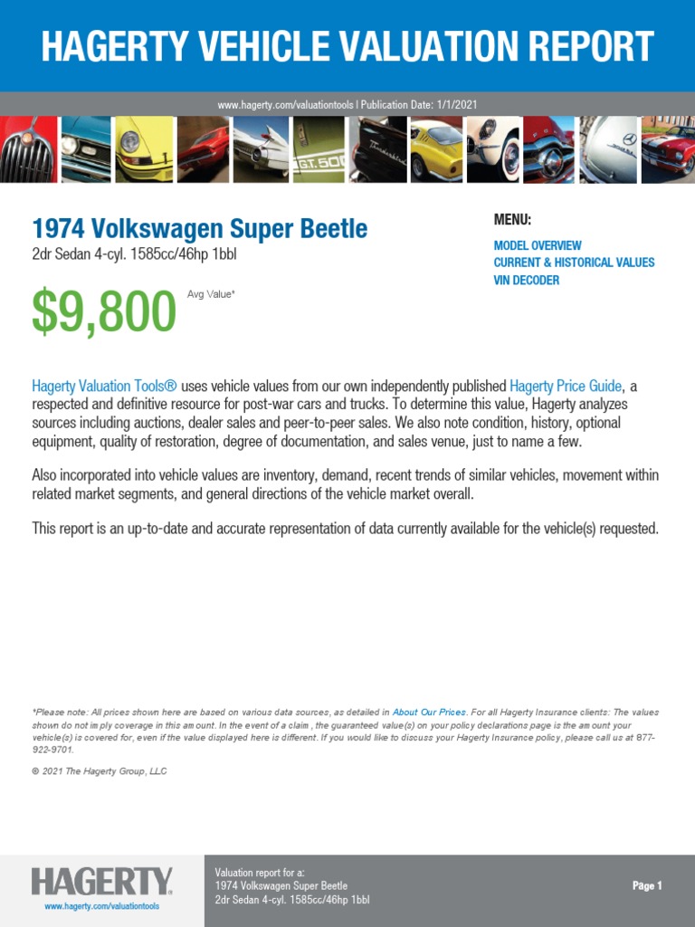 1974 Volkswagen Super Beetle Catalog and Classic Car Guide, Ratings and