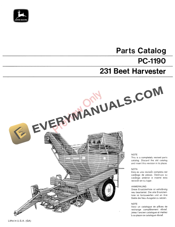 John Deere 231 Beet Harvester Parts Catalog PC1190 01NOV70