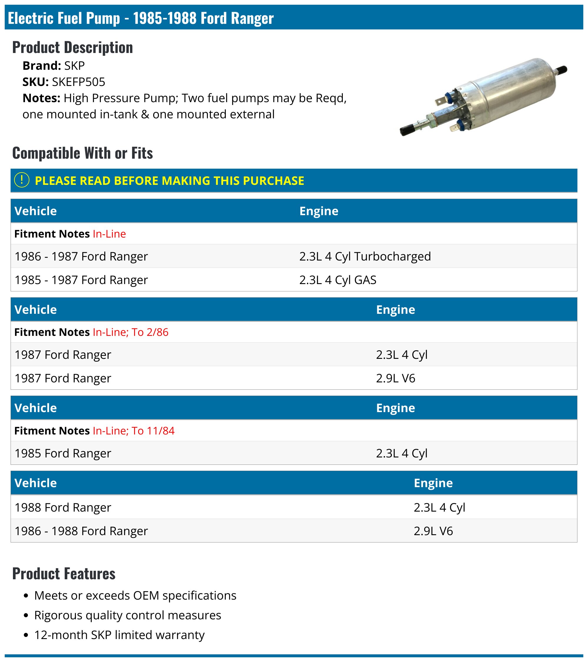 19851988 Ford Ranger Fuel Pump SKP SKEFP505