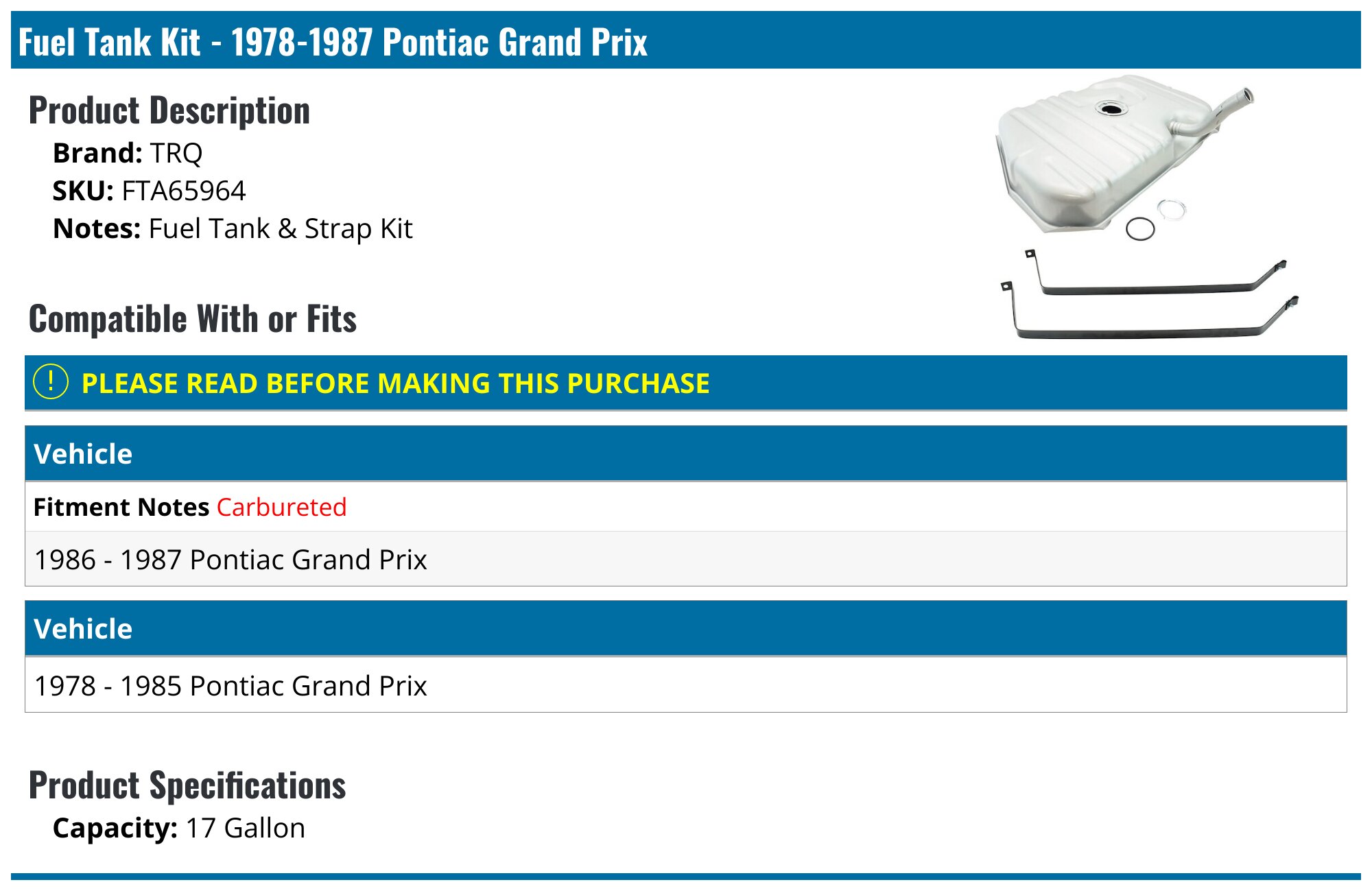 19781987 Pontiac Grand Prix Fuel Tank TRQ FTA65964