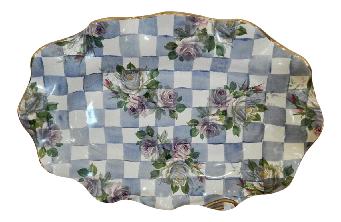 1990s Mackenzie Childs Blue Honeymoon Morning Glory Flower Check