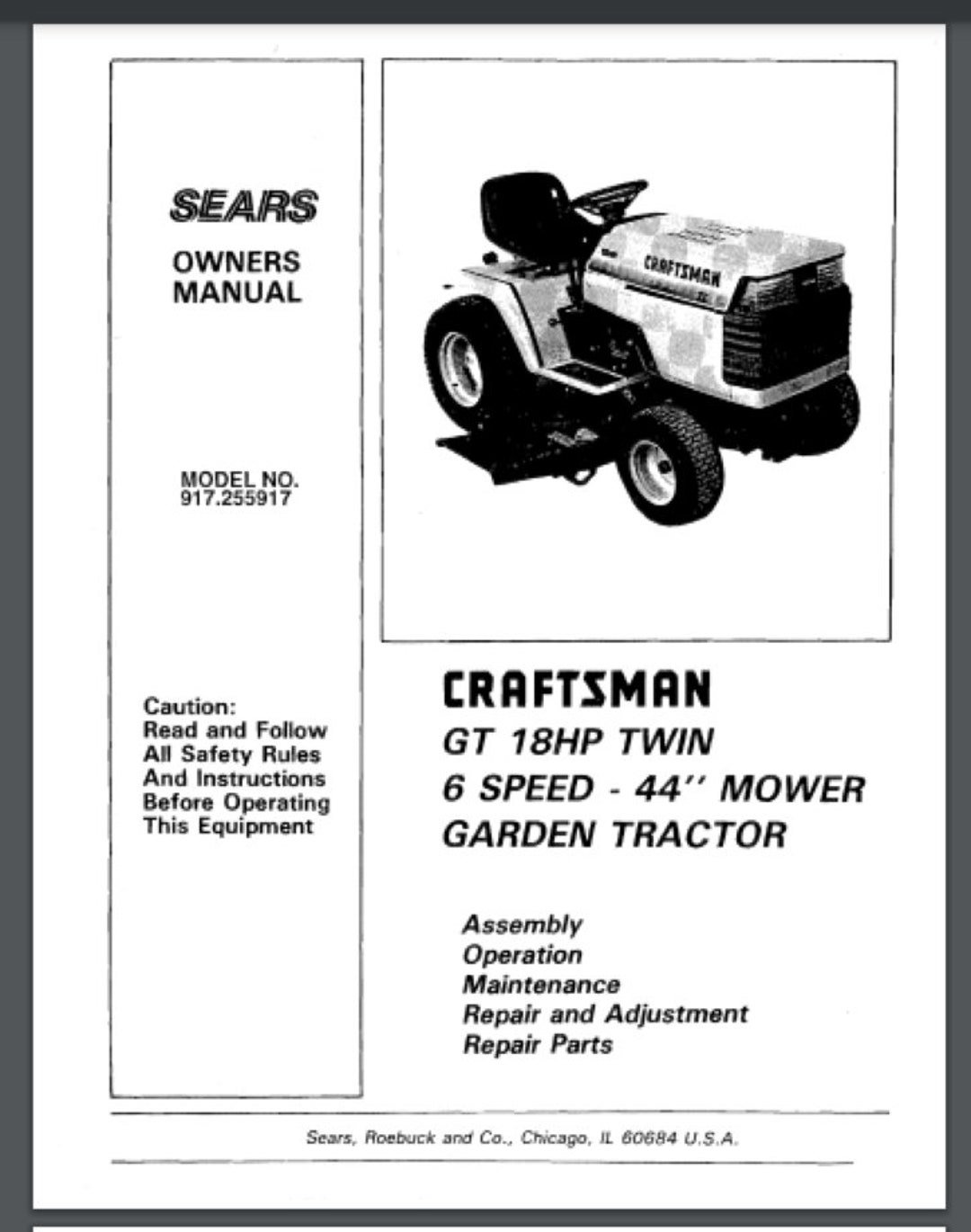 Craftsman 44 Inch GT 18 Garden Tractor 917.255917 Owner Parts Manual 52