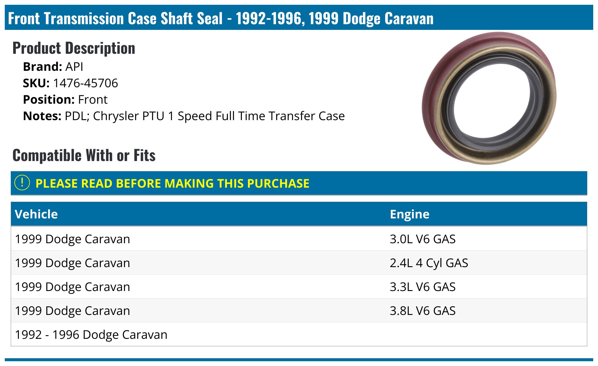 19921996, 1999 Dodge Caravan Transmission Case Shaft Seal API 1693