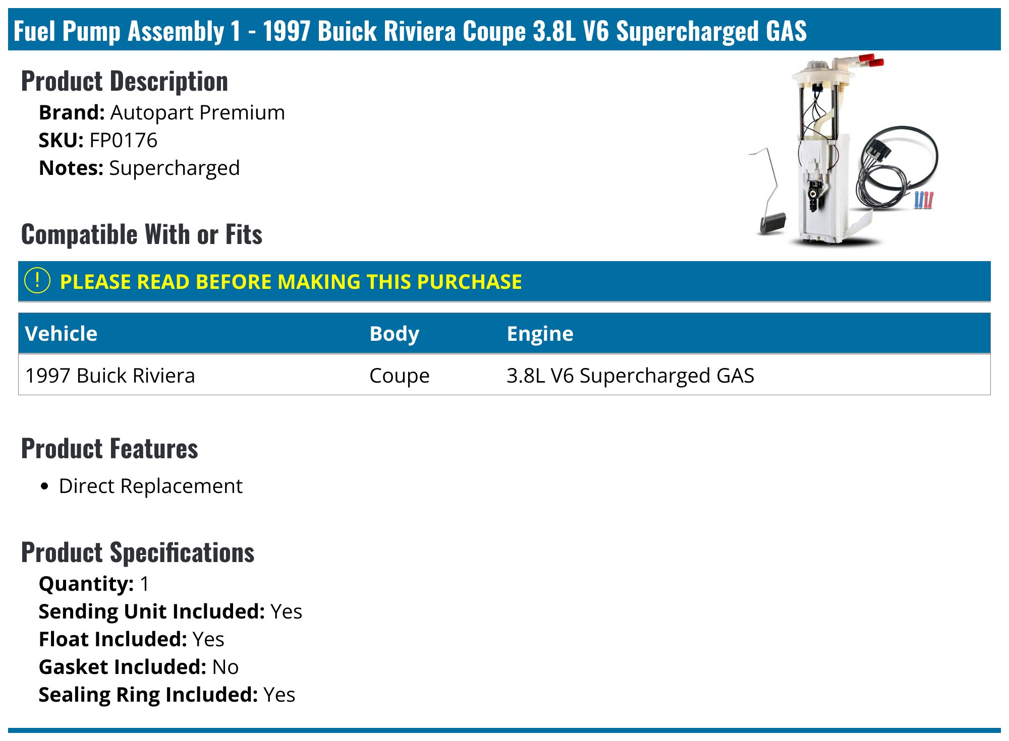 1997 Buick Riviera Fuel Pump Autopart Premium FP0176