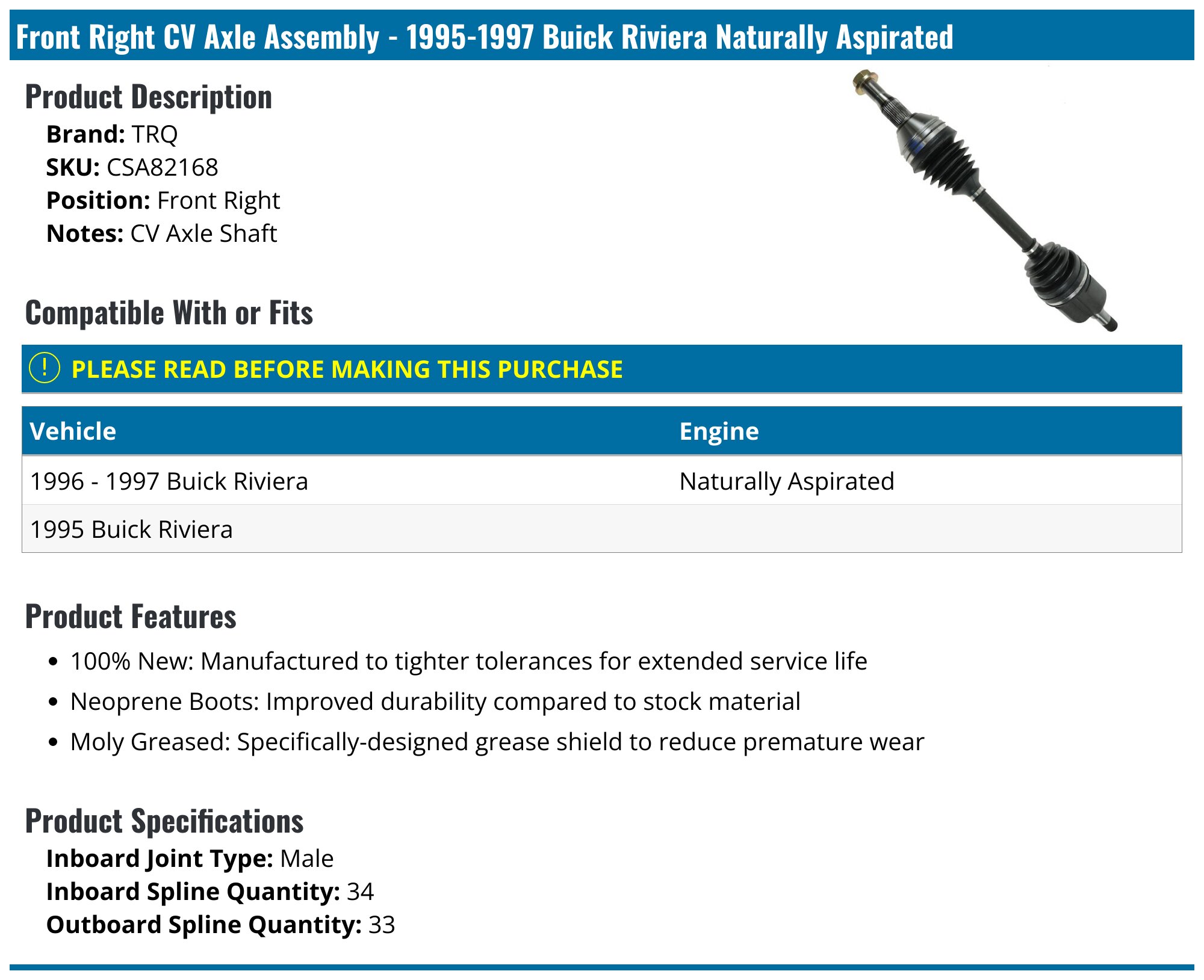 19951997 Buick Riviera Axle Assembly TRQ CSA82168 Front Right