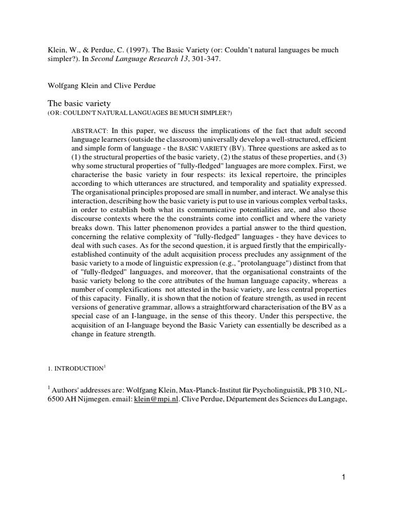 1997 Klein The Basic Variety PDF Second Language Acquisition Lexicon