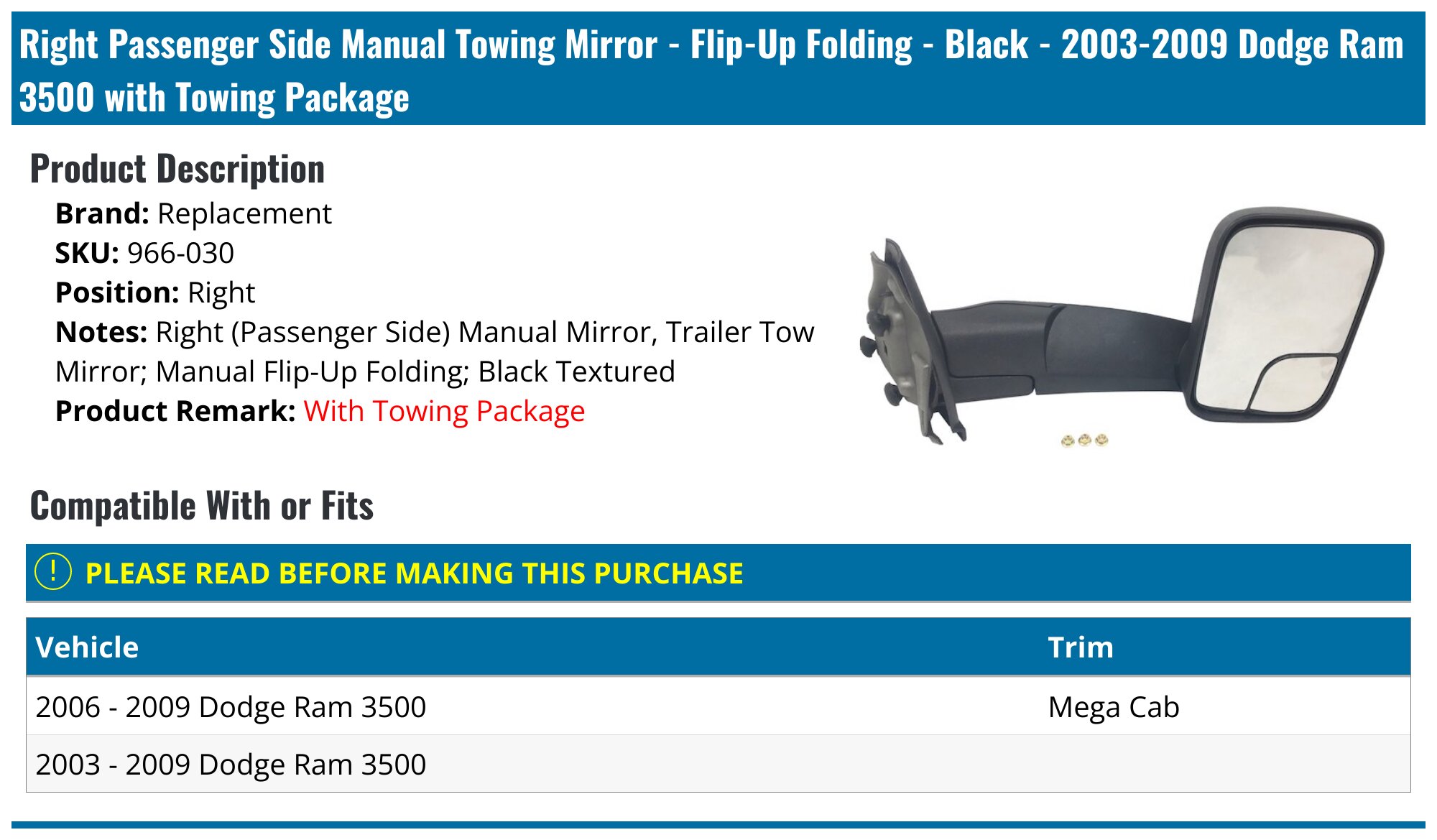 20032009 Dodge Ram 3500 Mirror Replacement 966030 Right