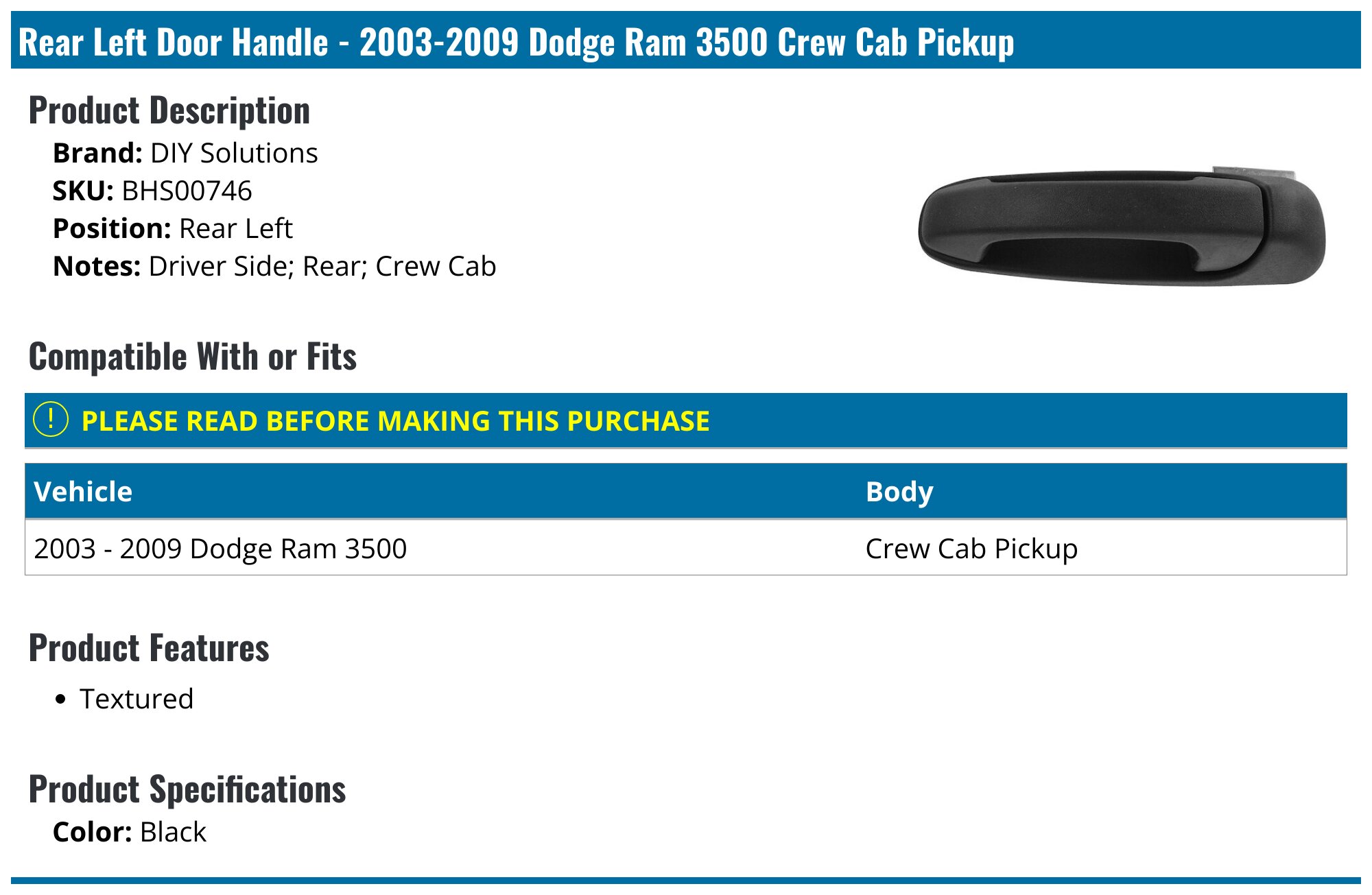20032009 Dodge Ram 3500 Door Handle DIY Solutions BHS00746 Rear