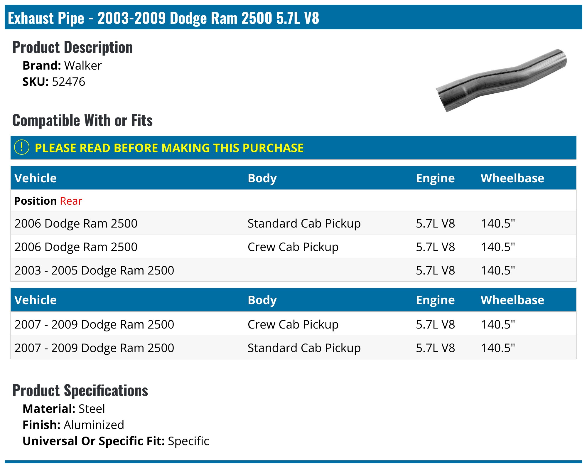 20032009 Dodge Ram 2500 Exhaust Pipe Walker 52476 Rear