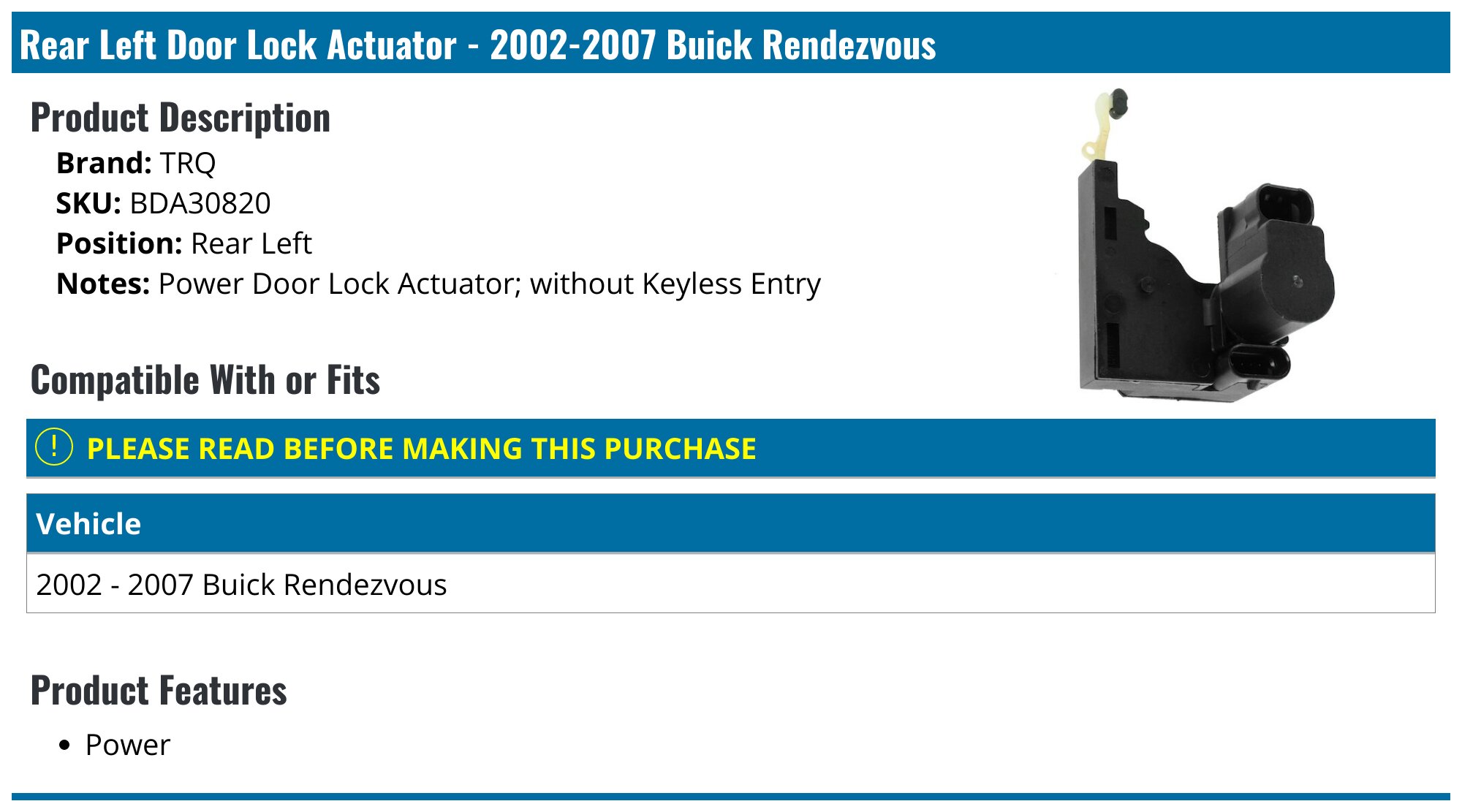20022007 Buick Rendezvous Door Lock Actuator TRQ BDA30820 Rear