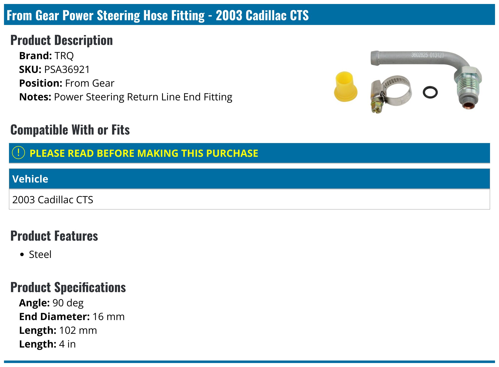 2003 Cadillac CTS Power Steering Hose Fitting TRQ PSA36921 From