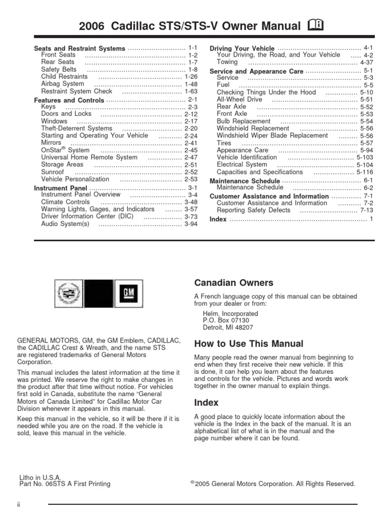 2006 Cadillac Sts OWNERS MANUAL 478 Pgs PDF Seat Belt Airbag