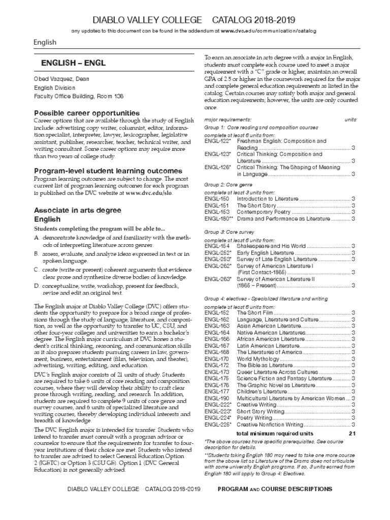 Diablo Valley College Catalog 20182019 English Engl PDF English