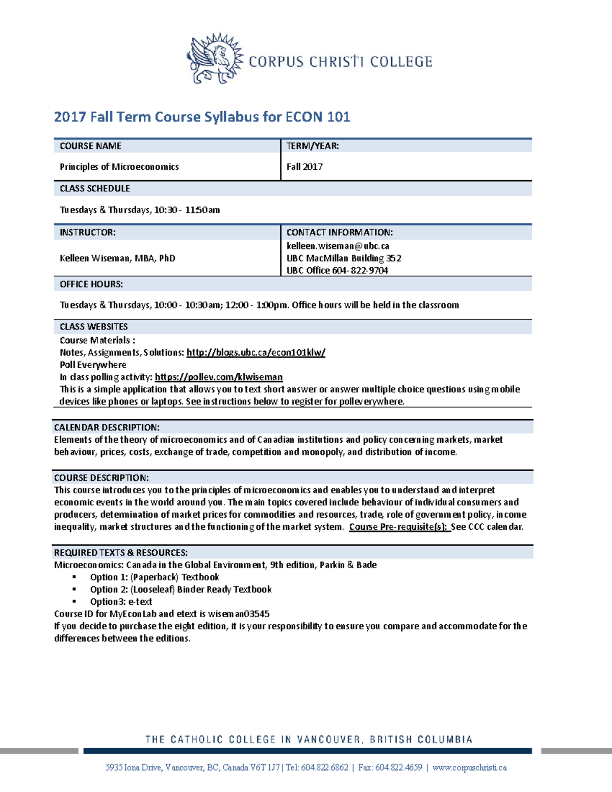 2017 fall Course Syllabus for ECON 101 2 2017 Fall Term Course