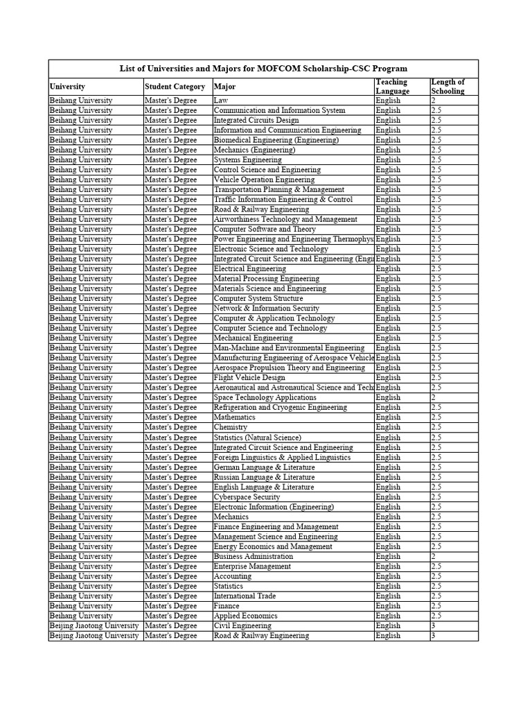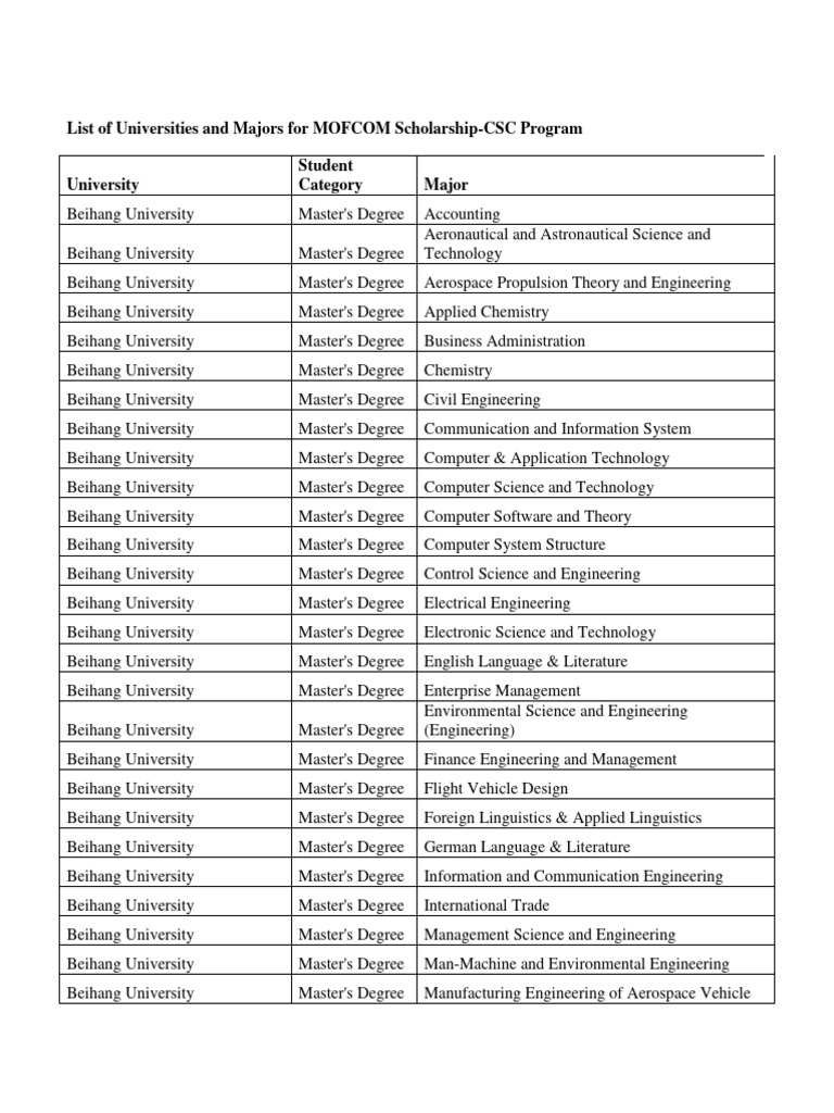 List of Universities and Majors For Scholar 240102 214643