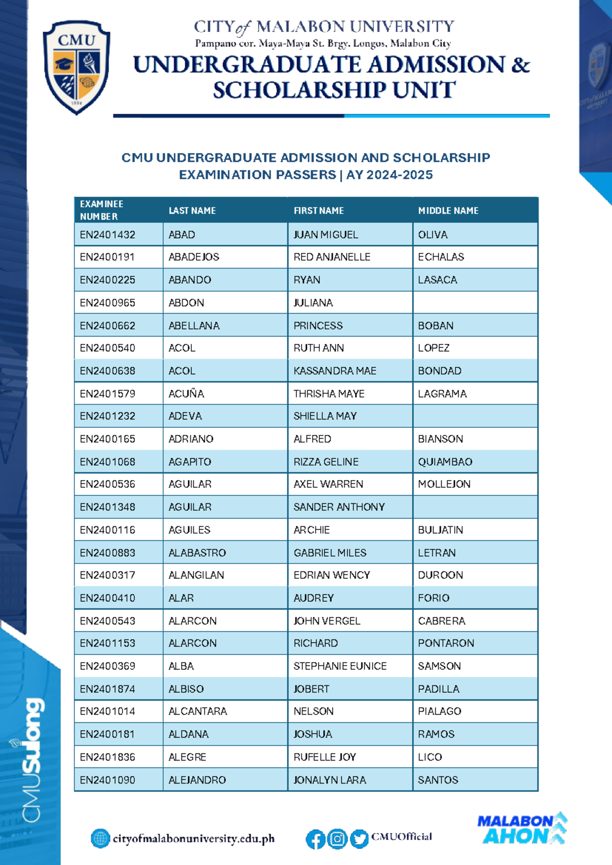 Undergraduate Admission AND Scholarship Examination Passers CMU