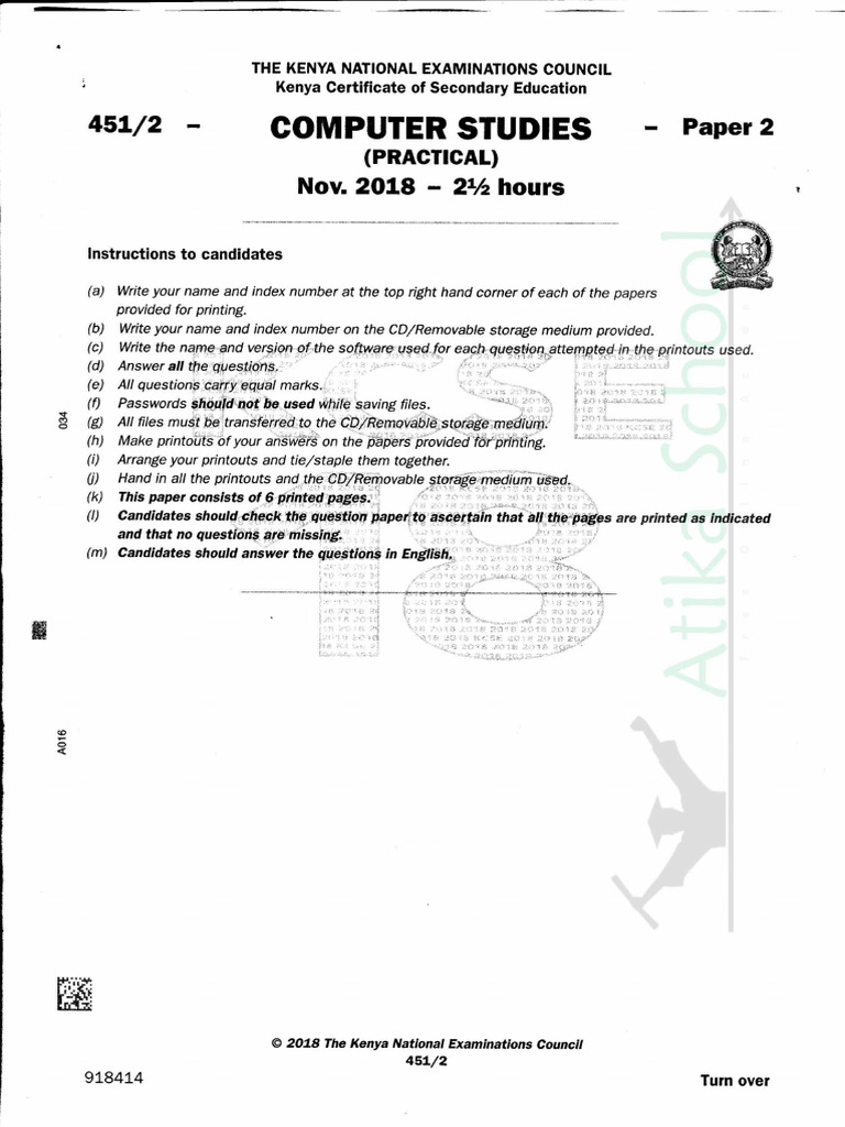 Computer Studies Paper 2 KCSE 2018 PDF