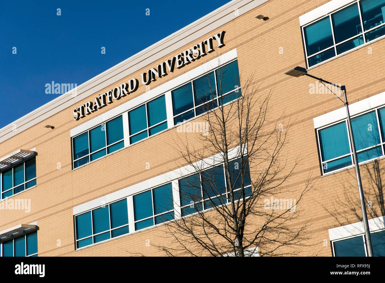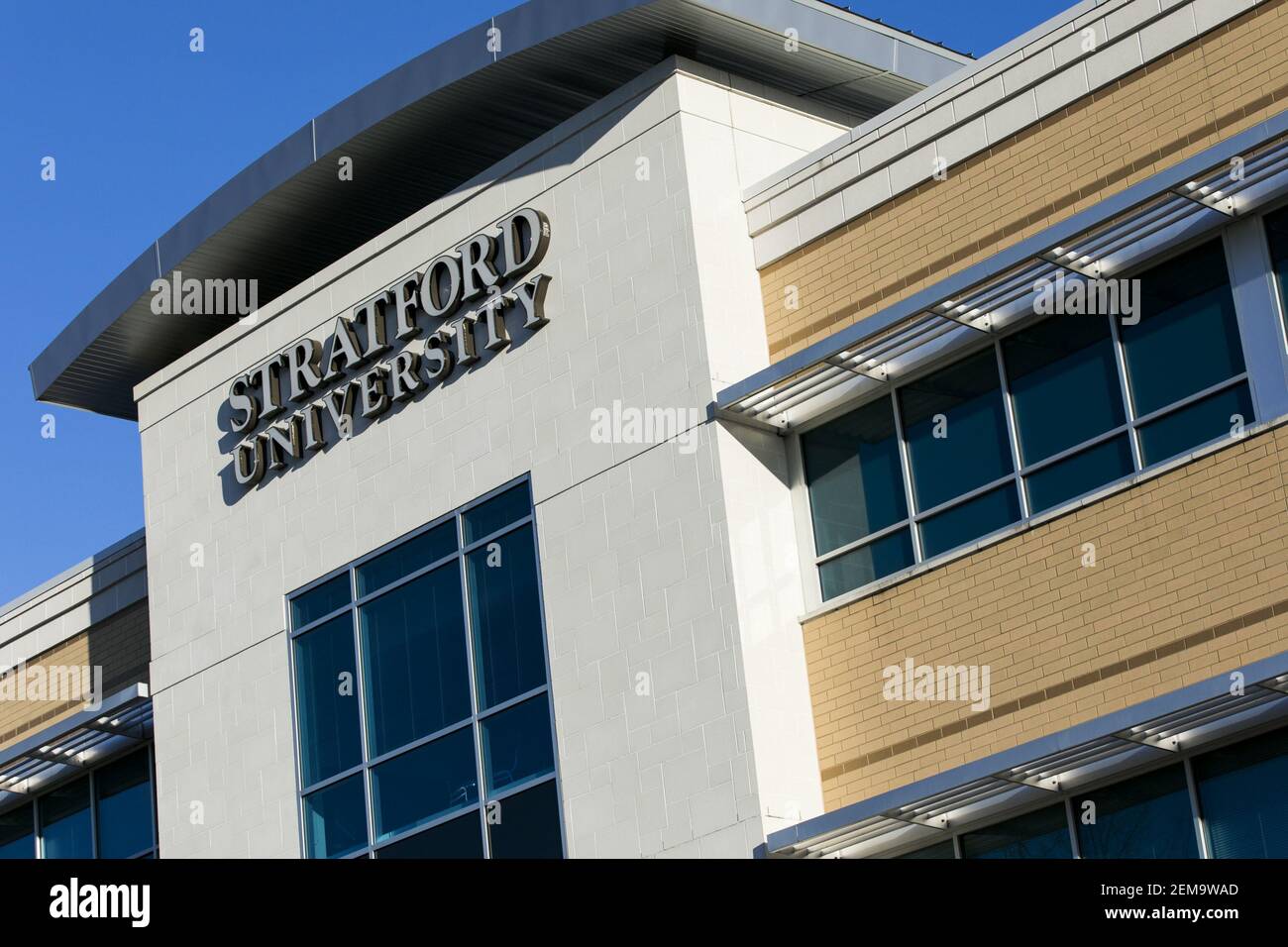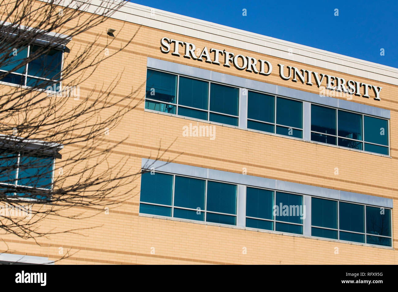 A logo sign outside of a facility occupied by Stratford University in