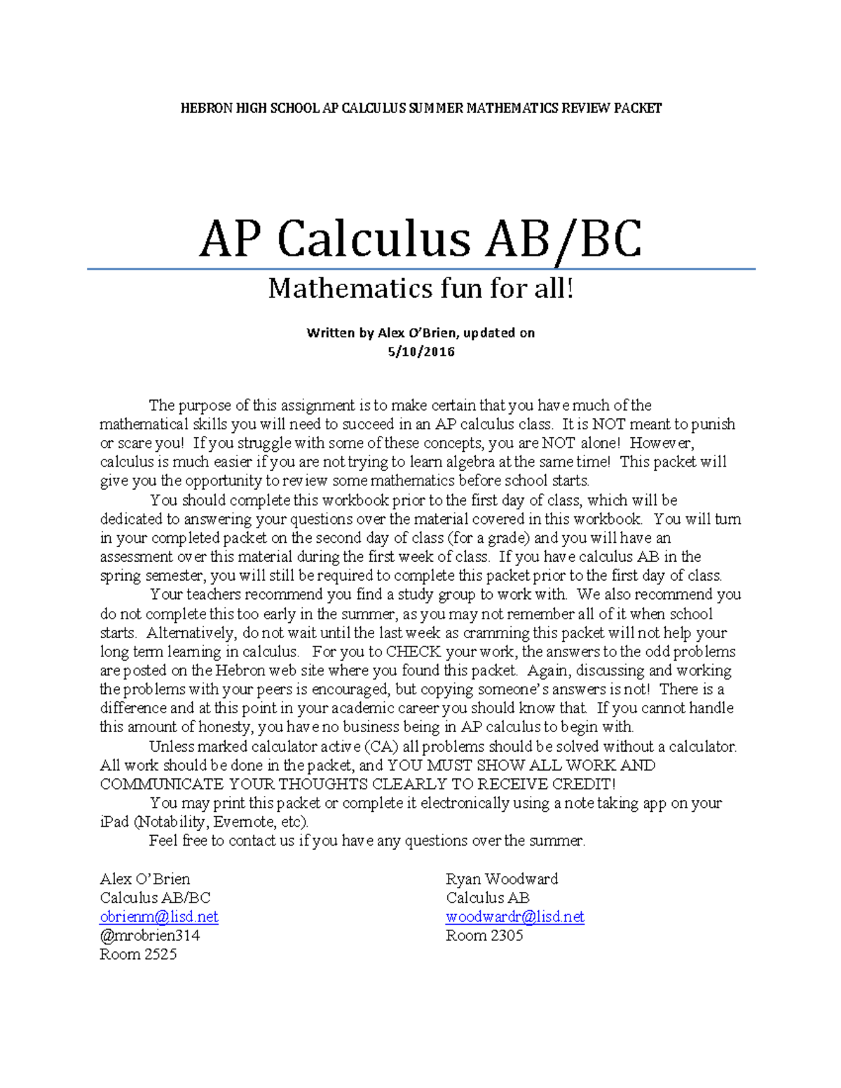 AP Calculus Summer Packet HEBRON'HIGH'SCHOOL'AP'CALCULUS'SUMMER