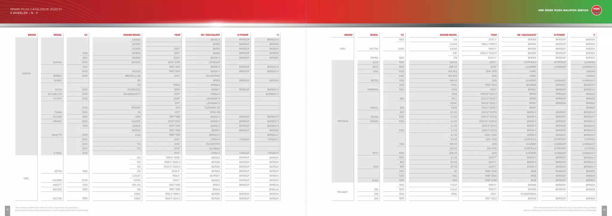 NGK Spark Plugs (Asia) 2019 ตารางเทียนเบอร์หัวเทียนเอ็นจีเค รถยนต์ 4W