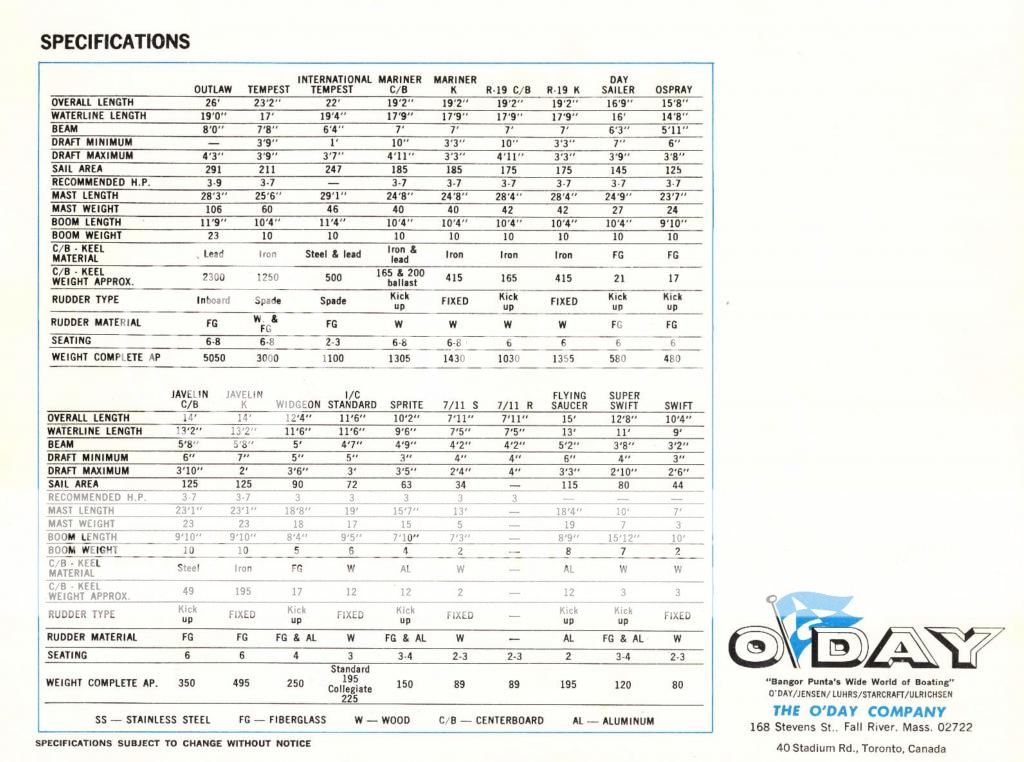 22 Foot O'day Sailboat Accessories Catalog