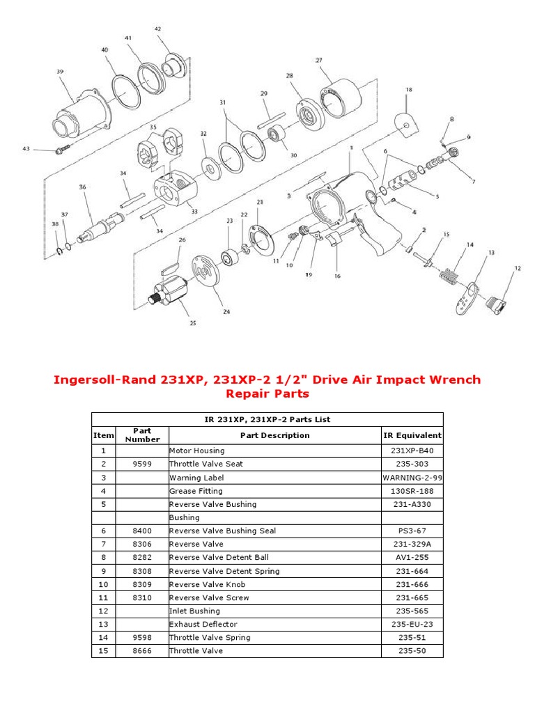 IngersollRand 231XP 231XP2 12 Drive Air Impact Wrench Repair Parts