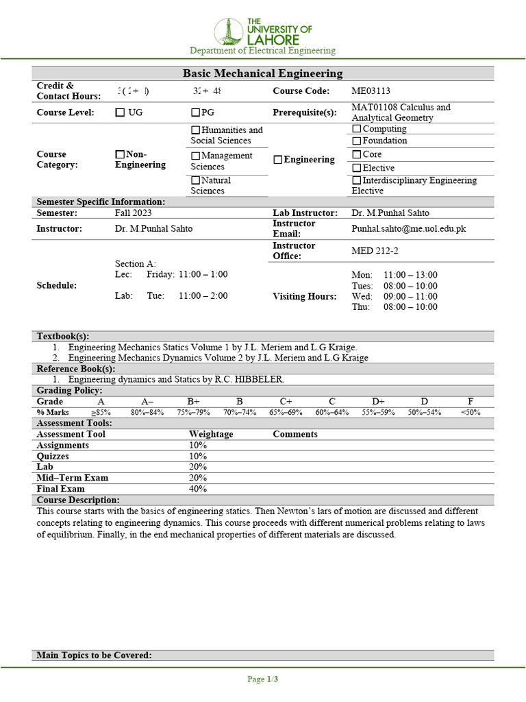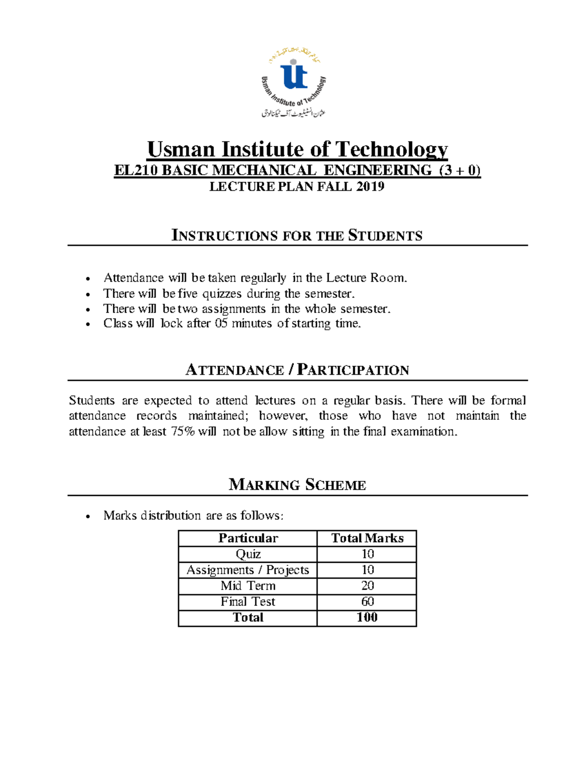 BMECourse Outline 2019 Usman Institute of Technology EL210 BASIC
