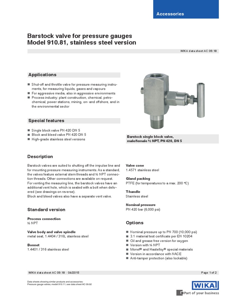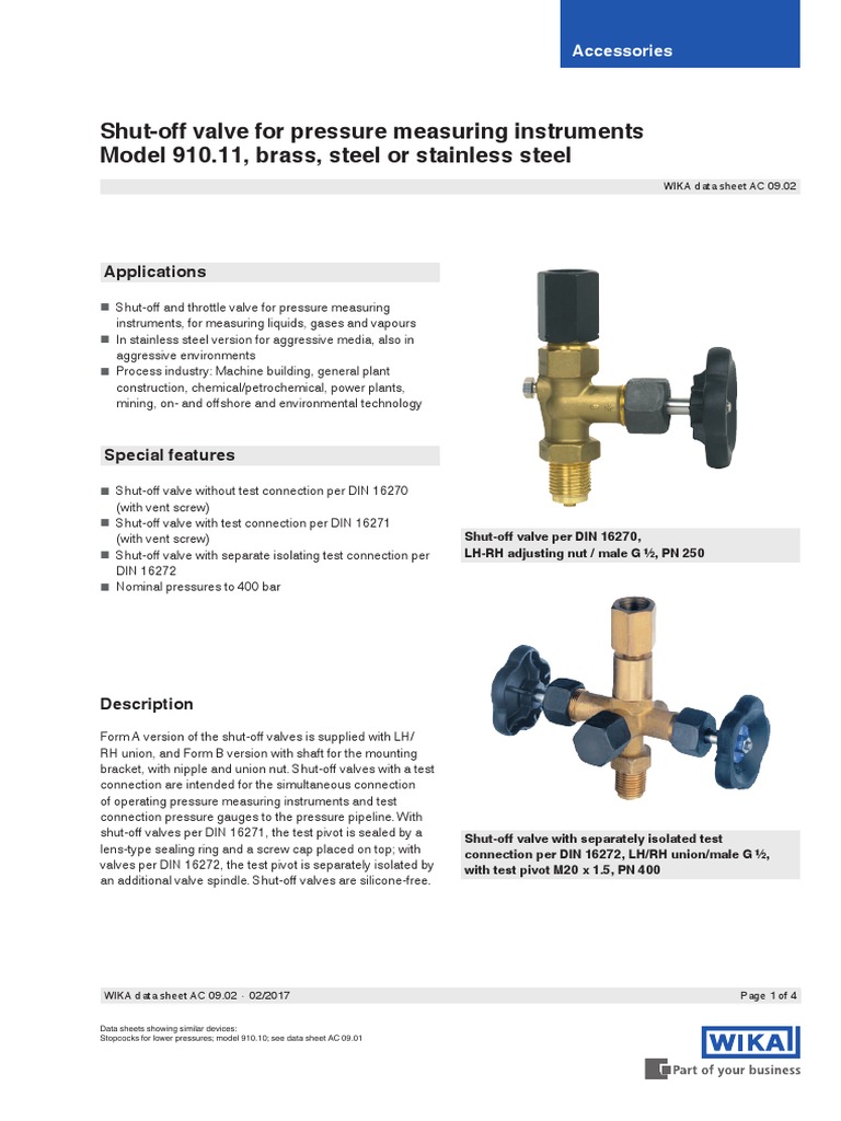 Wika 910.11 ShutOff Valve Catalog Page PDF Valve Stainless Steel