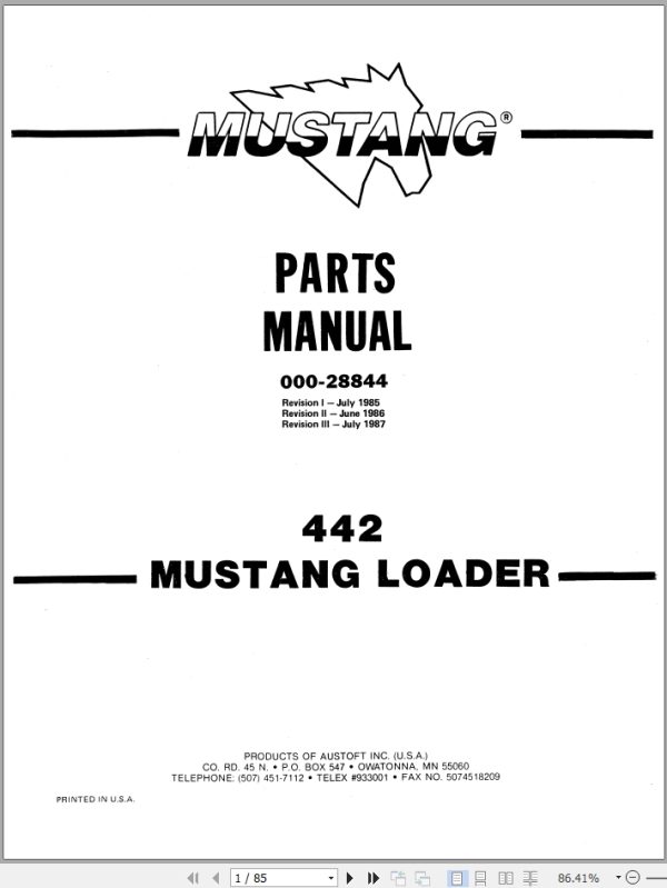 Mustang Skid Steer Loader 442 Parts Manual 00028844C