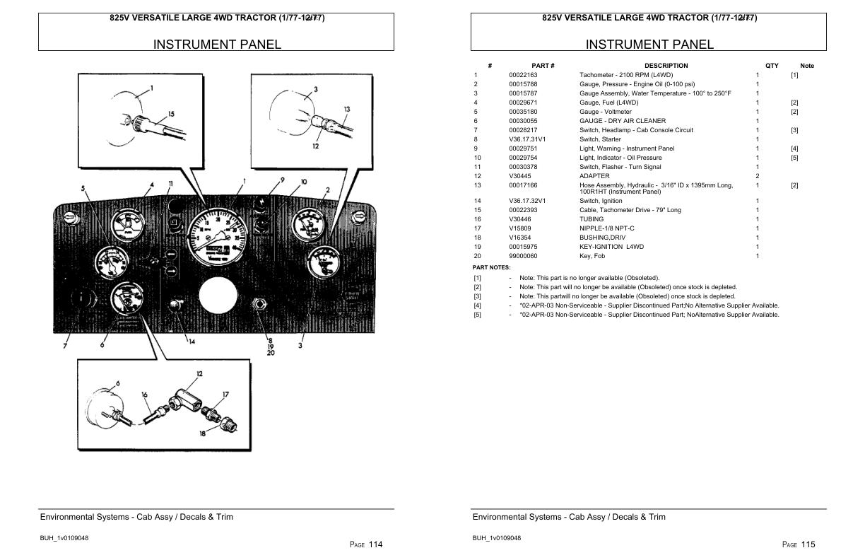 Versatile Tractor 825V Large 4WD Parts Catalog 1977