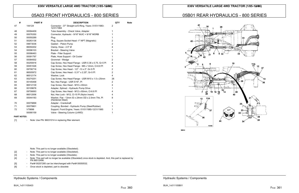 Versatile Tractor 836V Large 4WD Parts Catalog 19851986