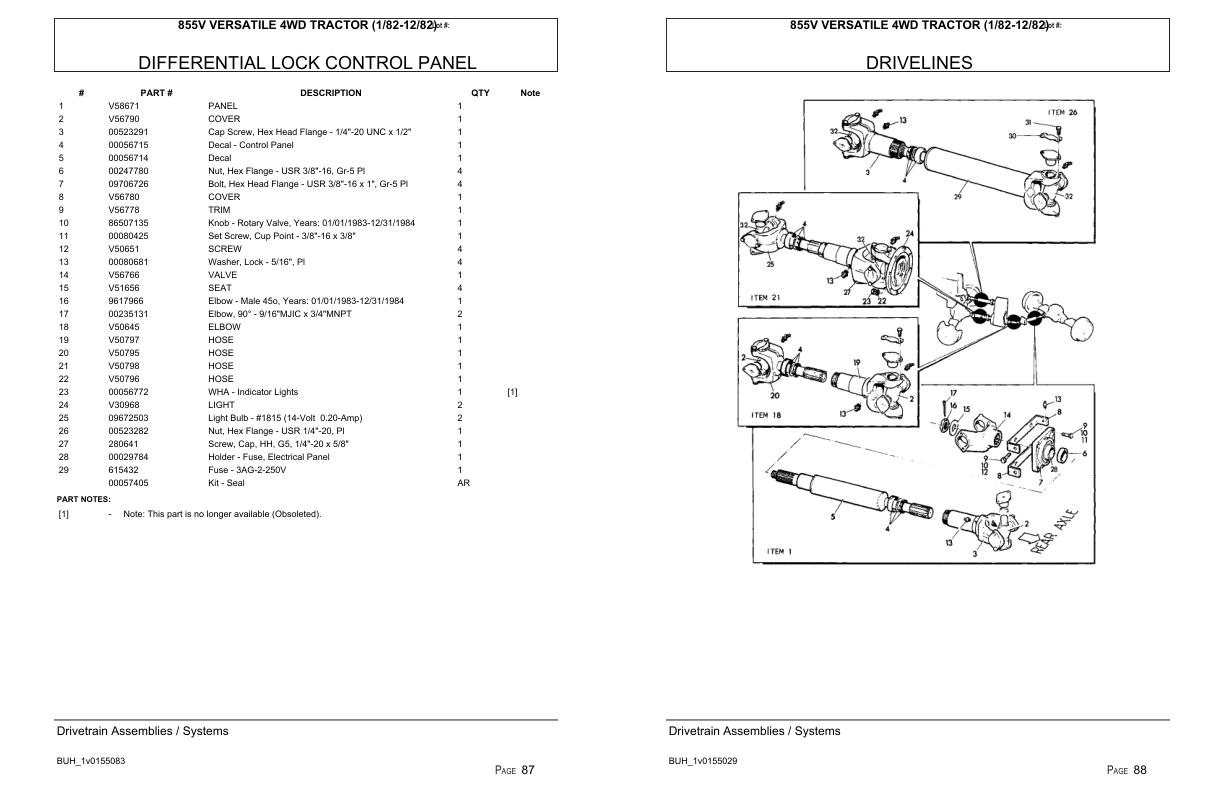 Versatile Tractor 855V 4WD Parts Catalog 1982
