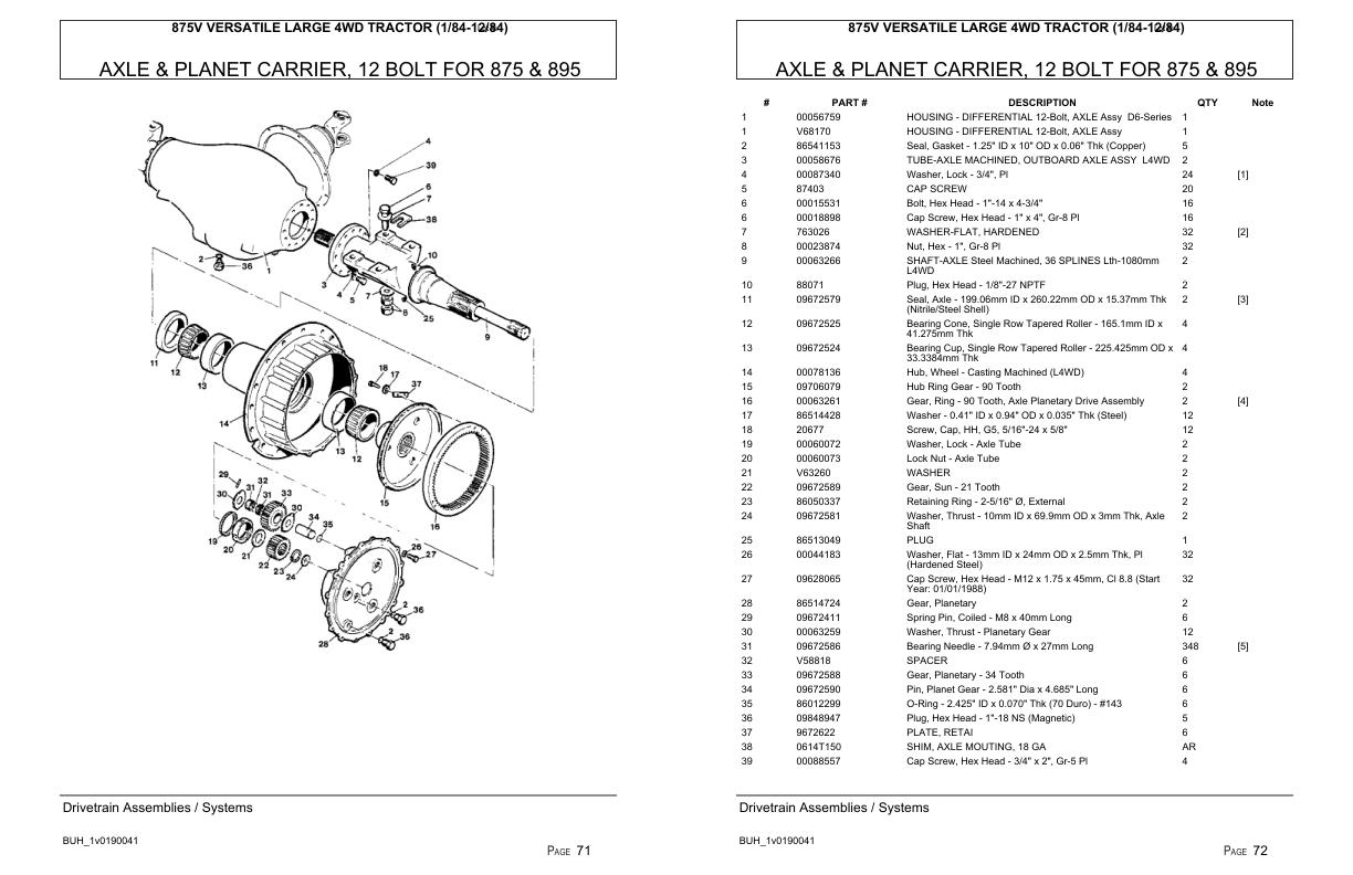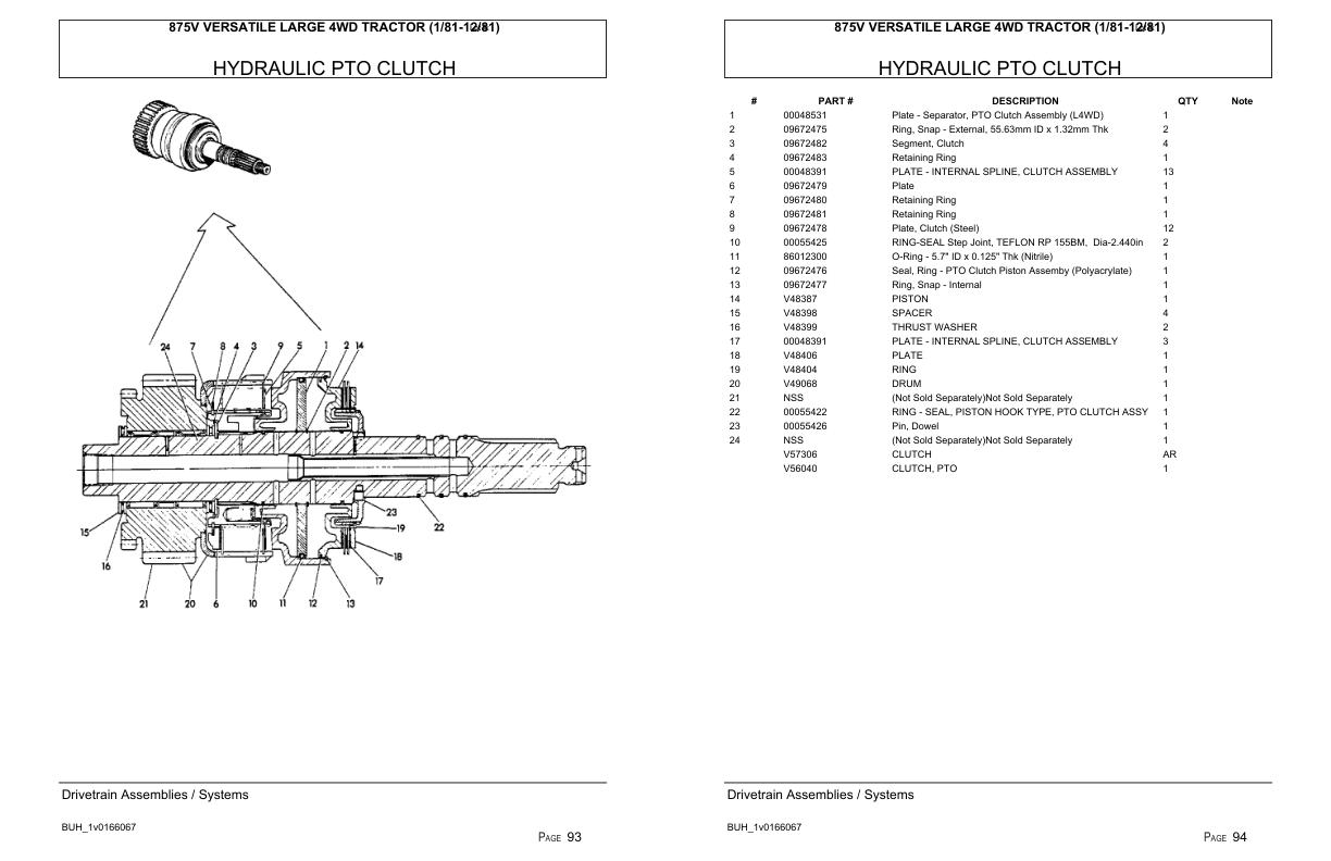 Versatile Tractor 875V Large 4WD Parts Catalog 1984