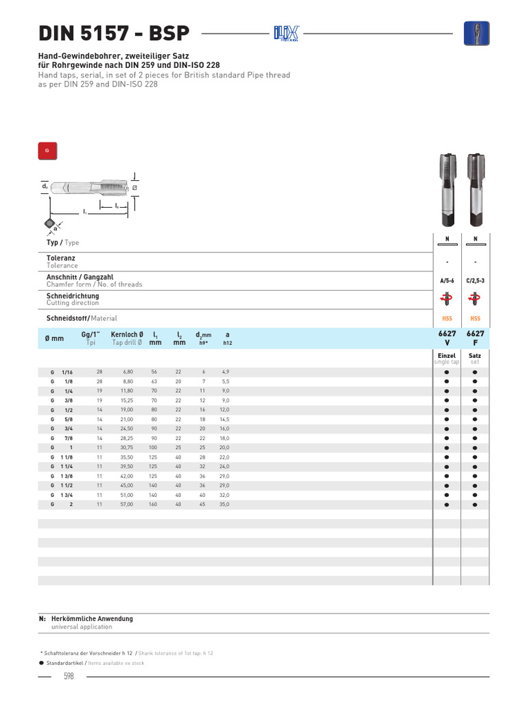 DIN 5157 BSP Hand Taps, Serial, in Set of 2 Pieces For British