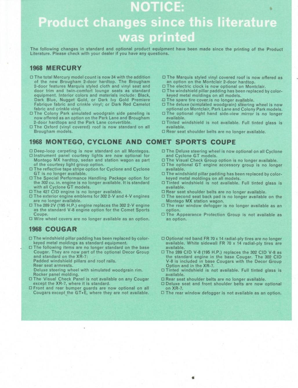 Promo Guide Full Line NOS 1968 Mercury Cougar ( 1968 Mercury