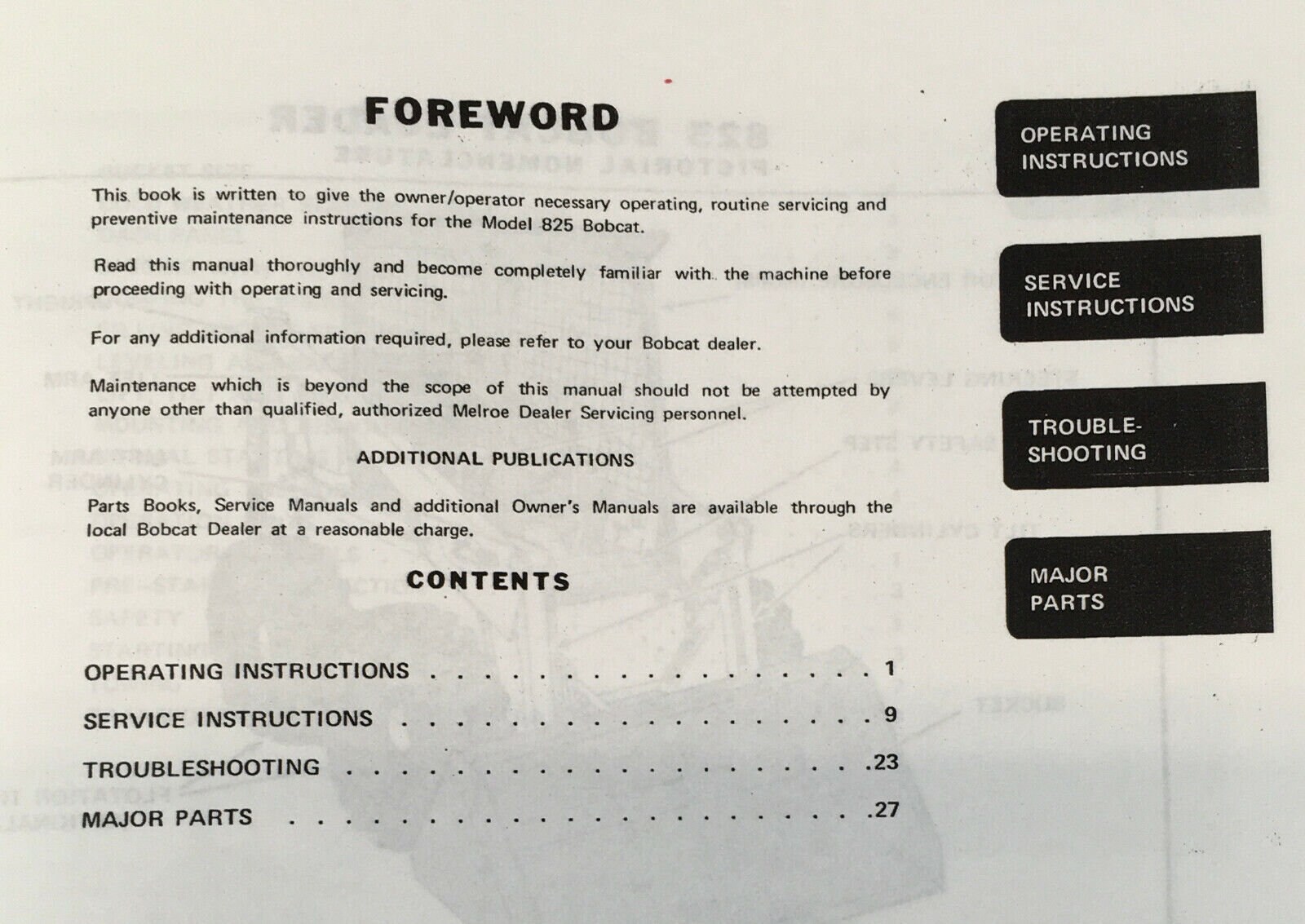 Bobcat 825 Skid Steer Loader Parts Catalog Operators Manual Owners Book