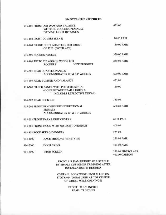 PORSCHE 914 CATALOGUE fiberglass and steel bodyparts