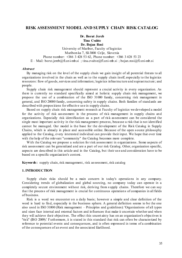 (PDF) Risk Assessment Model and Supply Chain Risk Catalog Bojan Rosi