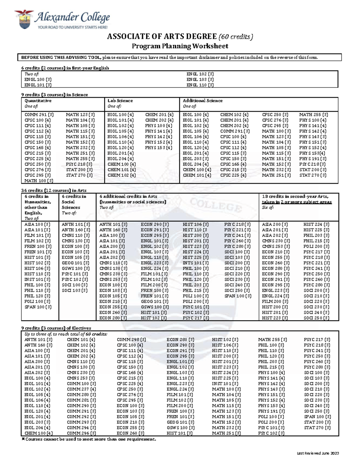 AA Degree Planning Worksheet June 2023 Last Reviewed June 2023