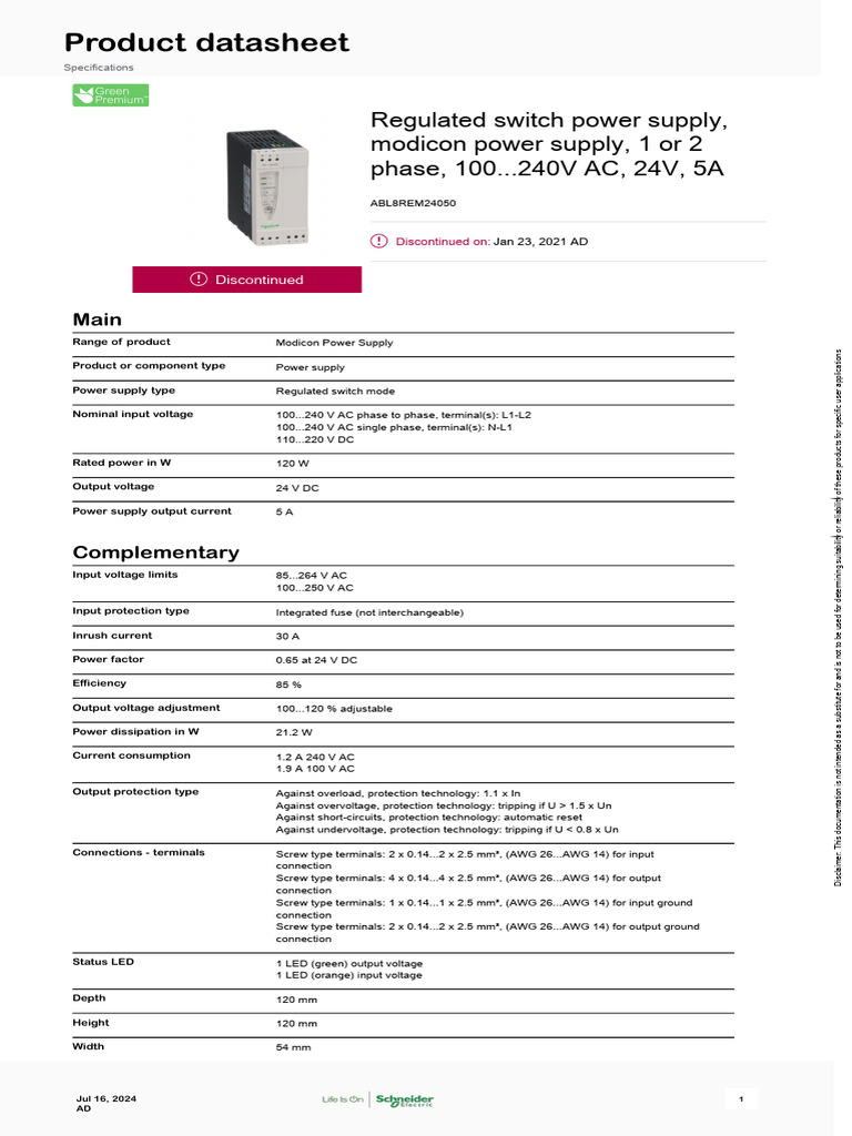Schneider Electric Abl8Rem24050 Power Supply 24V 5A