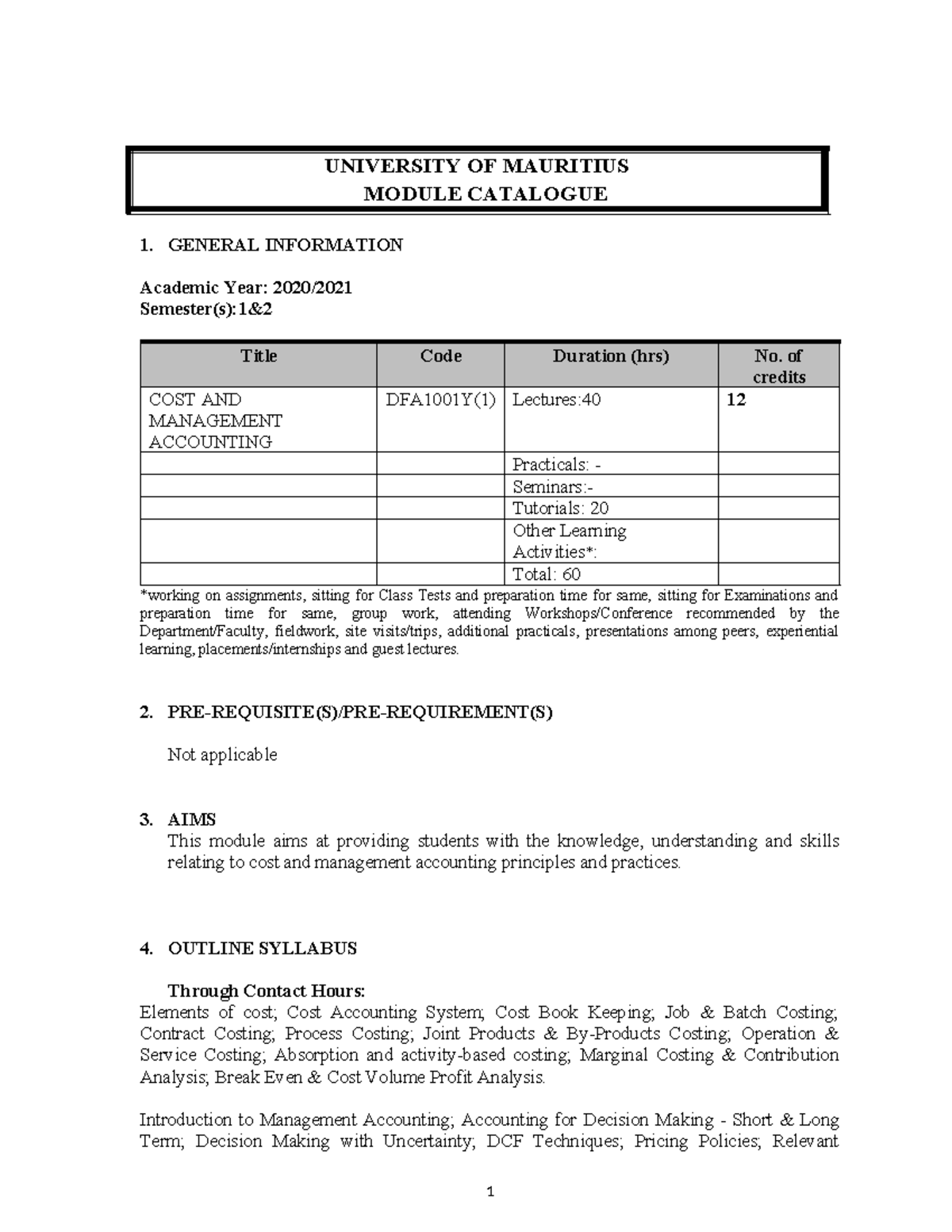 MSS cost and management accounting (3) UNIVERSITY OF MAURITIUS MODULE