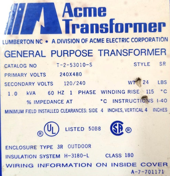 ACME Transformer T253007S 240/480V 50/60Hz 1 Phase. 4B21 Palmetto