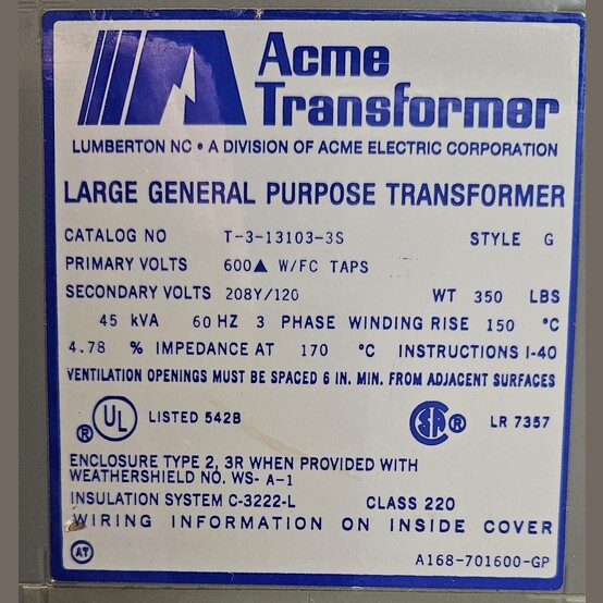 Acme 75 KVA Transformer, Catalog No. 125323S Proxibid