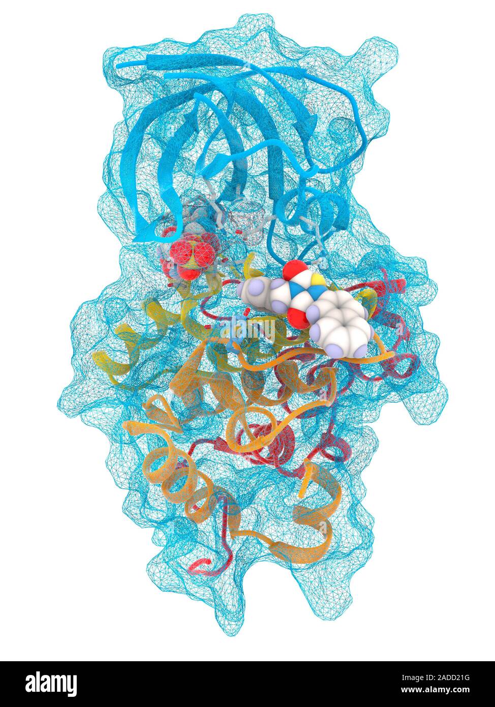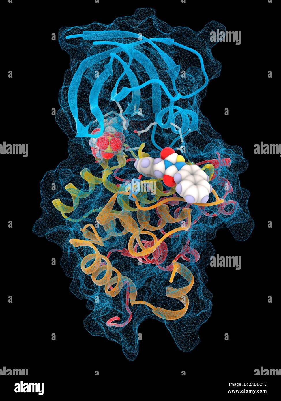 GSK3B enzyme complex with ADP and inhibitor. Illustration of the GSK3B