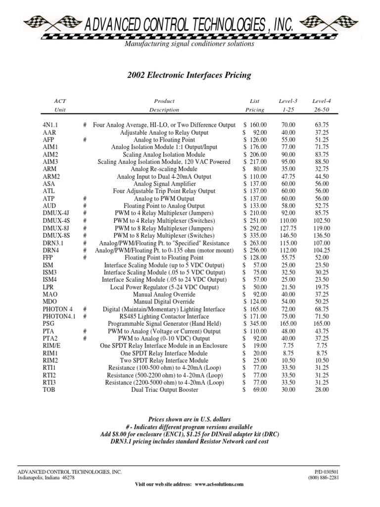 Advanced Control Technologies, Inc. 2002 Electronic Interfaces Pricing