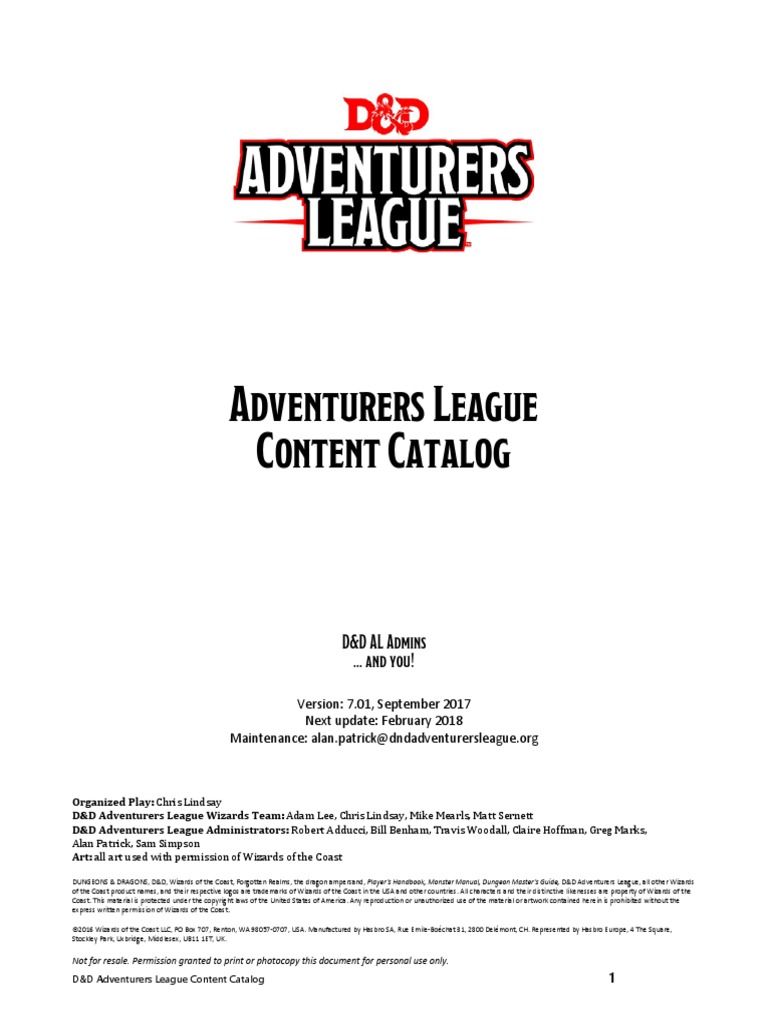 Adventurers League Content Catalogue v809