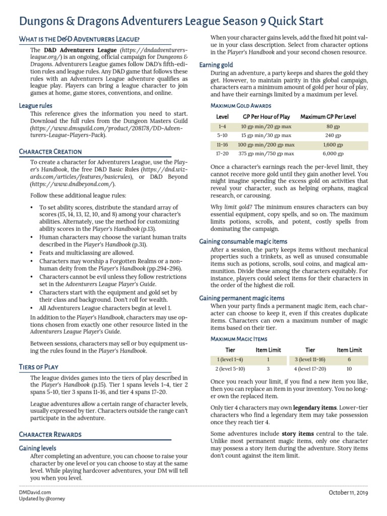 Adventurers League Season 9 Quick Reference Dungeon Masters Guild
