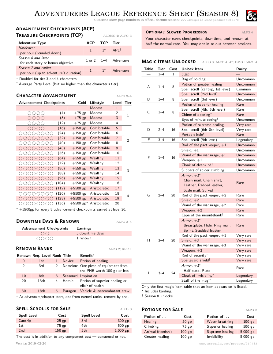 Adventurers League Reference Sheet (Season 8) Dungeon Masters Guild